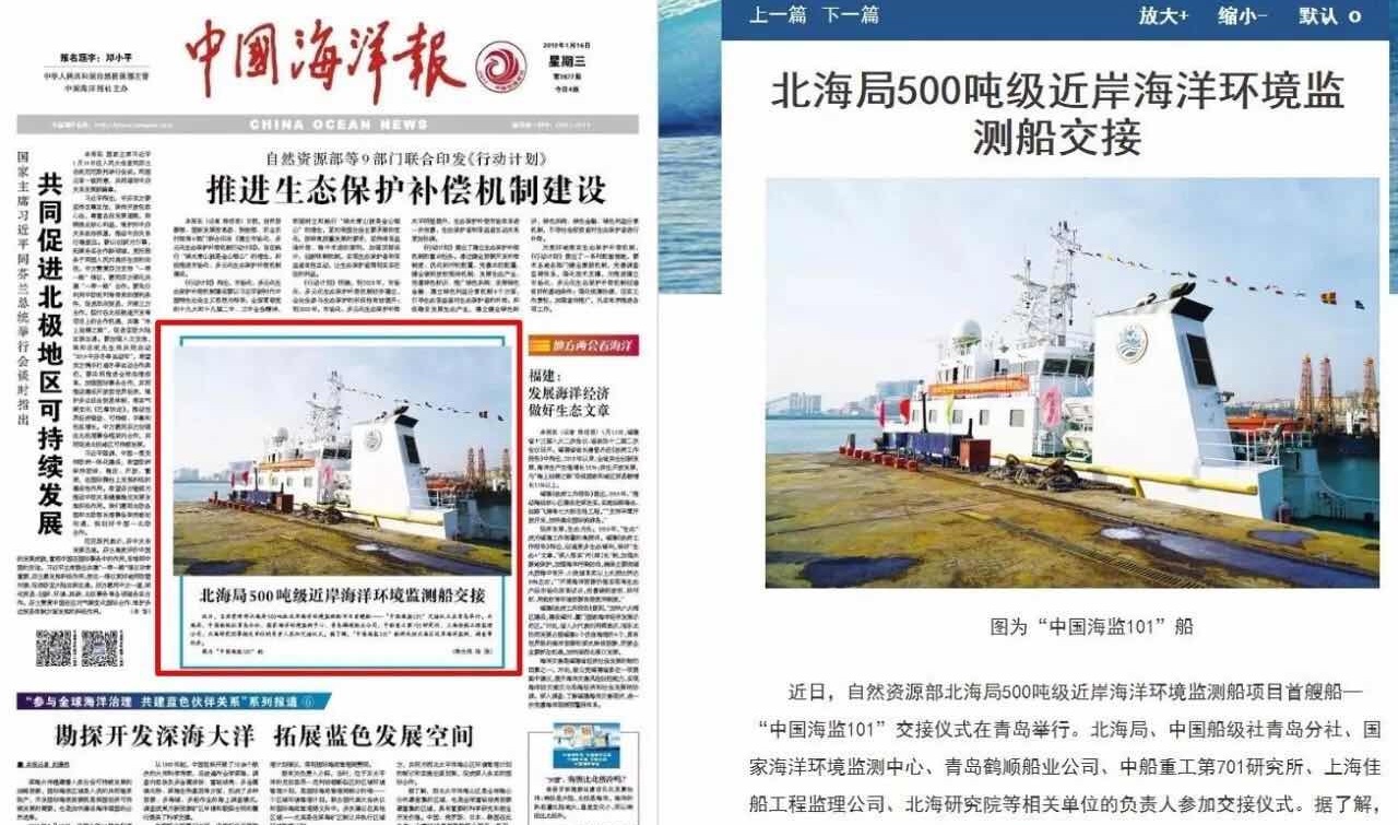 近日,自然資源部北海局500噸級近岸海洋環境監測船項目首艘船—“中國海監101”完成交接,我中心為該型船設計生產的專用甲板機械設備也隨之正式投入使用。