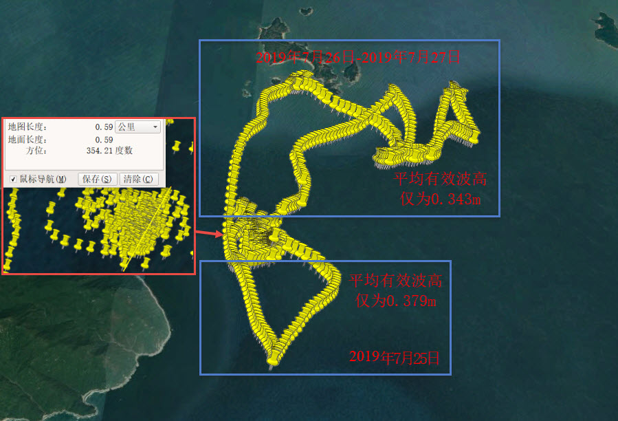 藍鯨波浪滑翔機所處的試驗海域波浪較小,水深較淺,同時還伴隨有沿岸流場的影響,這種海況對于利用波浪動力前進的波浪滑翔機來說是極為不利的,也是對其定點錨泊能力的極端考驗。回收時,三臺藍鯨波浪滑翔機累計在線航行三十六天,累計航程超過1000公里,在平均有效波高不到0.5m且有流場干擾的極端海況條件下,藍鯨-150型波浪滑翔機完成了小于一公里半徑內的高精度定點觀測。基于試驗結果,當有效波高低于0.3m時,藍鯨-150型波浪滑翔機明顯的動力不足,受潮流影響嚴重,位置會受流影響發生偏移,當海面有效波高達0.5m以上時,藍鯨-150型波浪滑翔機具有較強的動力和轉向能力,可自行進行位置修正,2019年7月21日至2019年7月24日期間,有效波高均保持在0.4m以上,最大波高達0.86m,在此期間藍鯨-150型波浪滑翔機定位精度高達590m,可在錨定點進行有效的定點錨泊觀測,本航次也再一次驗證了藍鯨系列波浪滑翔機在極端海況條件下的定點觀測能力。