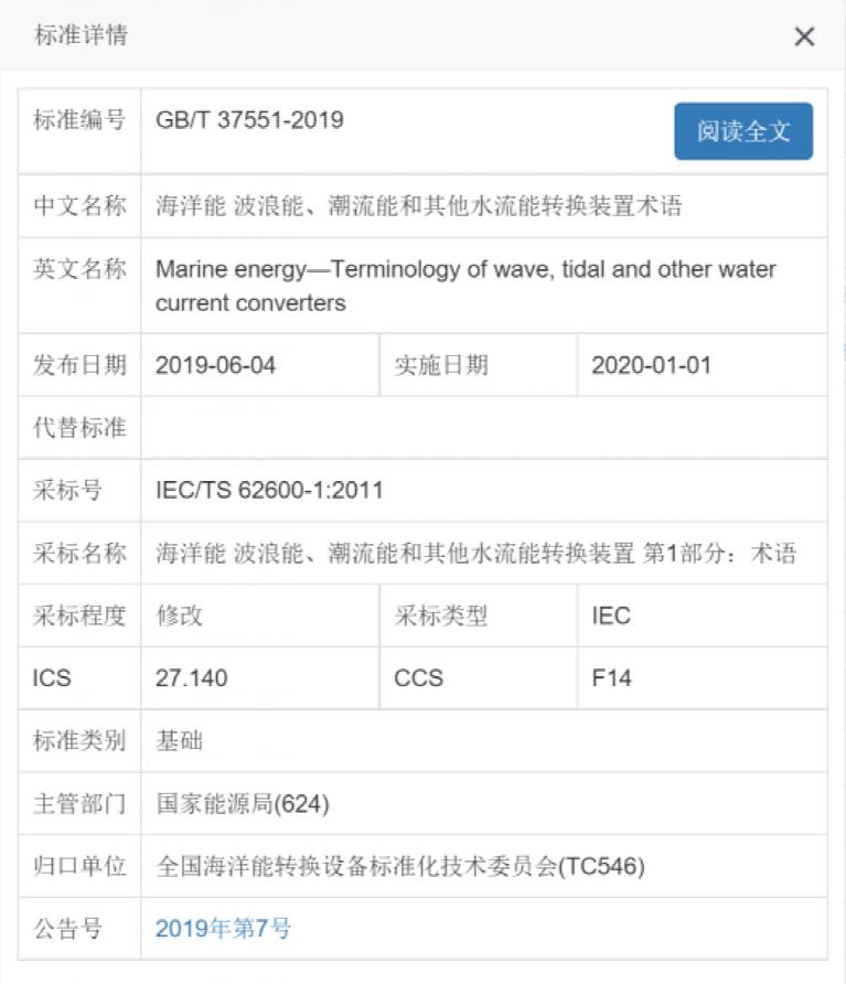歷經四年時間,多輪專家討論,二十九稿修改完善,國家標準GB/T 37551-2019海洋能  波浪能、潮流能和其他水流能轉換裝置術語》于日批準發布將在202011日頒布實施。該標準使用重新起草法修改采用國際標準IEC/TS 62600-1:2011《海洋能  波浪能、潮流能和其他水流能轉換裝置  1部分:術語》,是海洋能源領域國際標準引進來的第一個標準,也是海洋能源領域國際標準轉化為國家標準的第一個成功案例。該標準由國家海洋技術中心主持編寫,參與起草單位有哈爾濱大電機研究所、中國科學院廣州能源研究所、哈爾濱工程大學等十家單位。