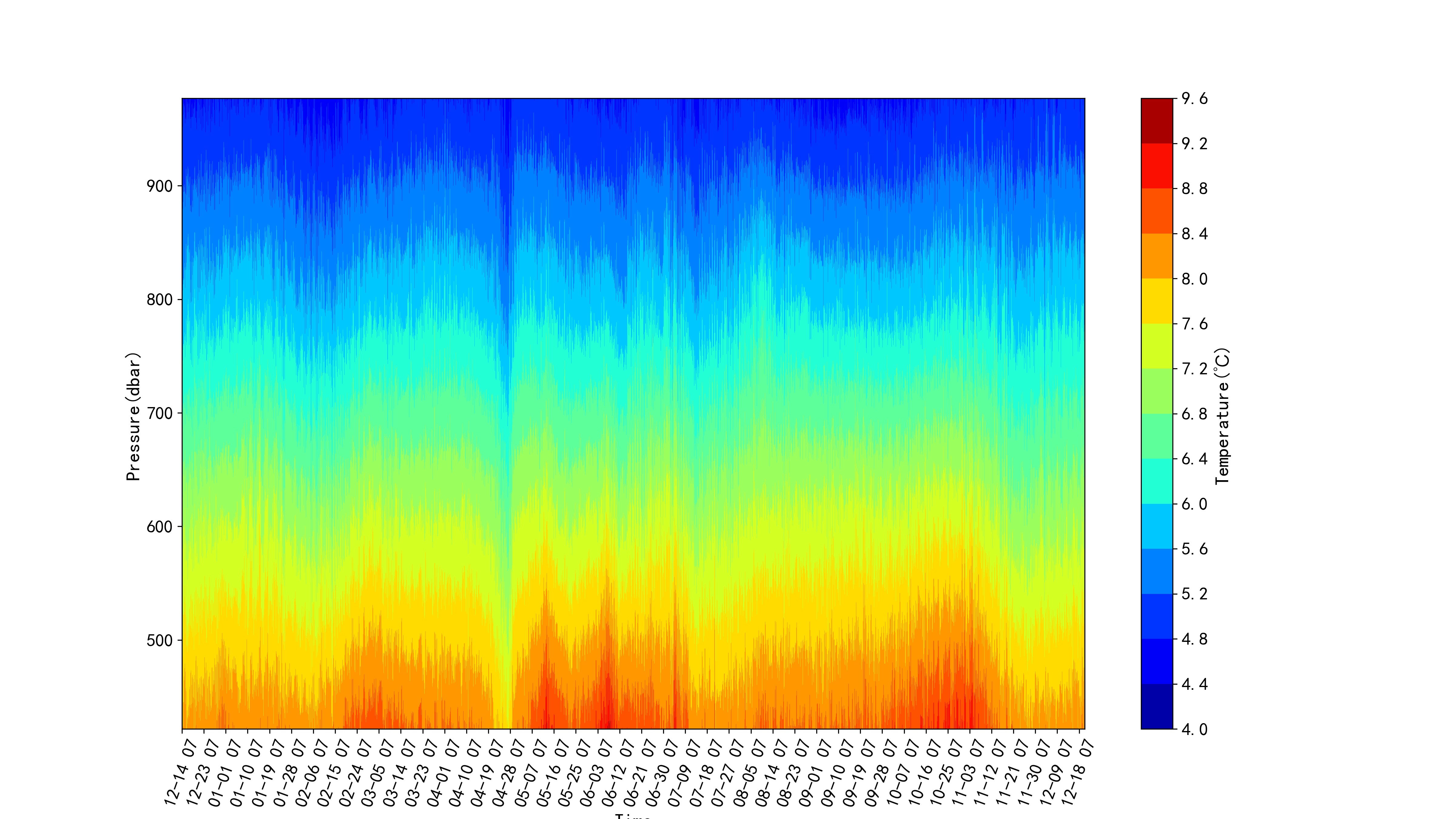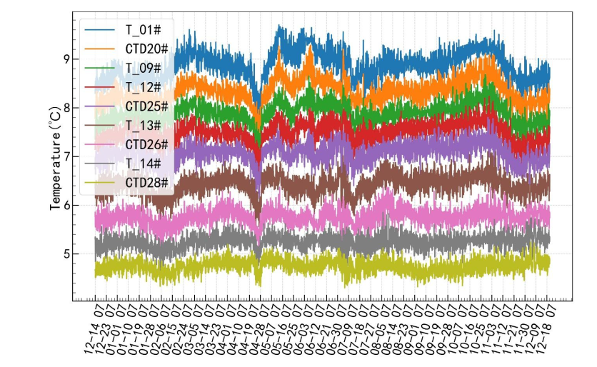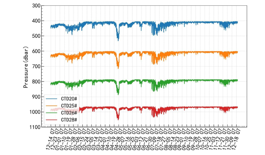 從布放至2019年12月20日回收,整套感應耦合傳輸溫鹽深鏈共計有效在位運行371天,多臺套傳感器共計無故障工作時間超80000小時,獲取數據8899組,數據傳輸成功率達到100%。通過岸站接受到的數據進行分析,在2018年4月28日左右,2019年7月9日至2018年7月27日期間,溫鹽深鏈捕捉到了兩次非常明顯的慣性振蕩。