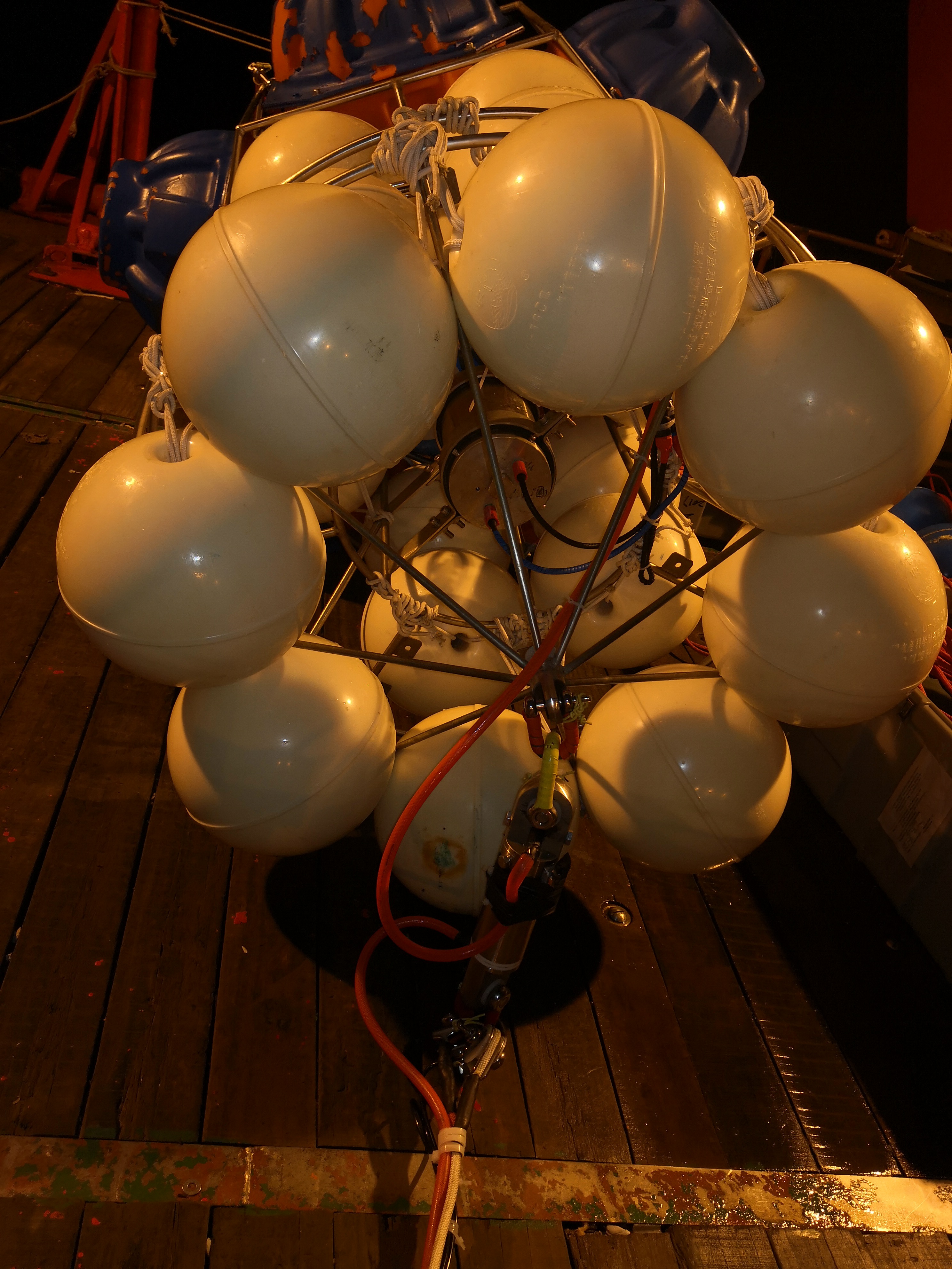 2019年12月20日,在西太平洋海域,伴隨著白色浮球組成的潛標主浮體出水,到最后一臺儀器收艙,標志著中國科學院海洋研究所準實時傳輸深海剖面錨系觀測潛標順利回收,同時由我中心傳感器室自主研發的感應耦合傳輸溫鹽深鏈為期1年的中期海試工作圓滿完成。