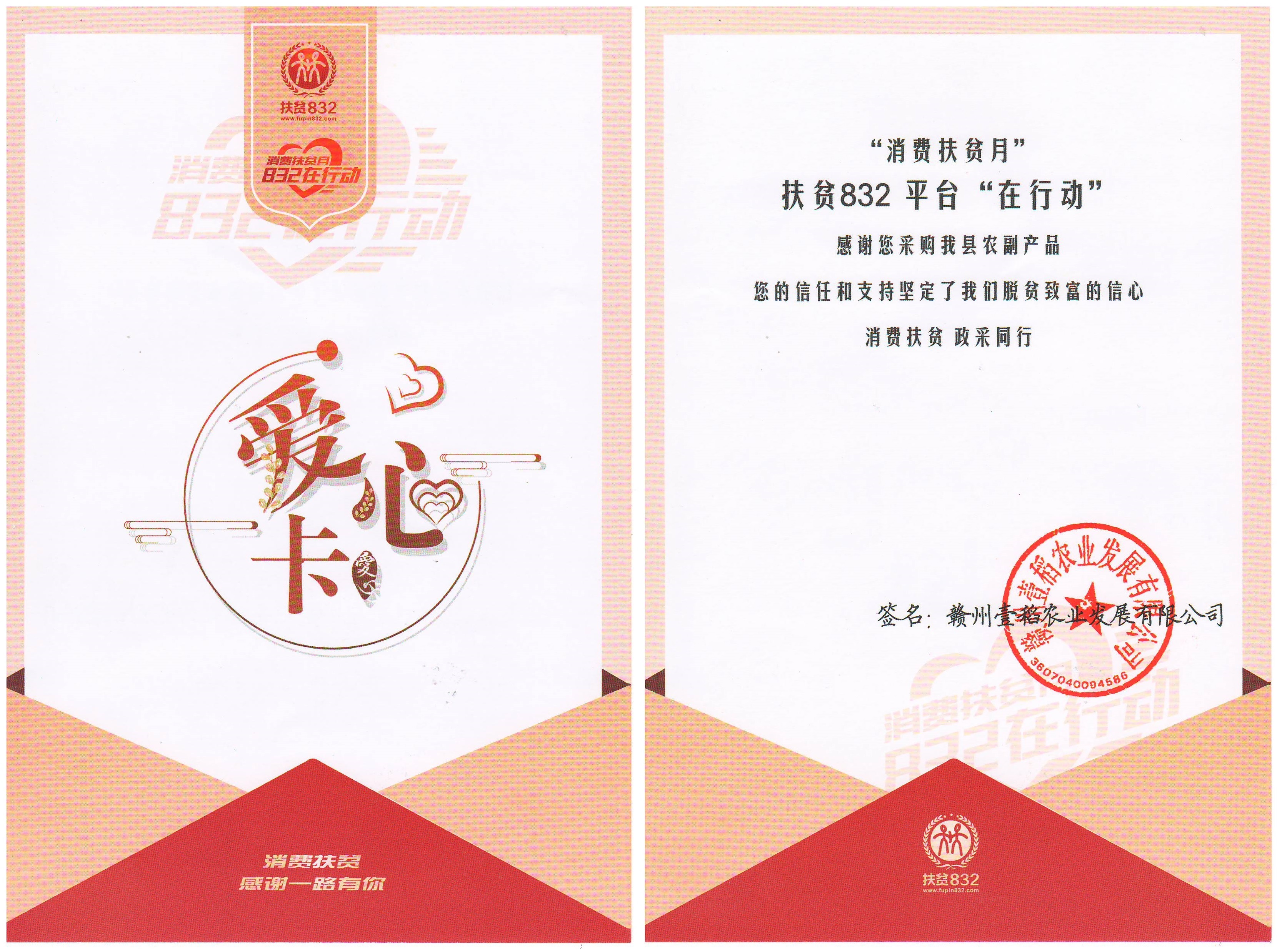 自然資源部定點貧困縣的農副產品代銷公司多次對中心“以買代幫”的助力方式表示衷心感謝,贛州壹稻農業發展有限公司還特意寄來了表達謝意的愛心卡。
