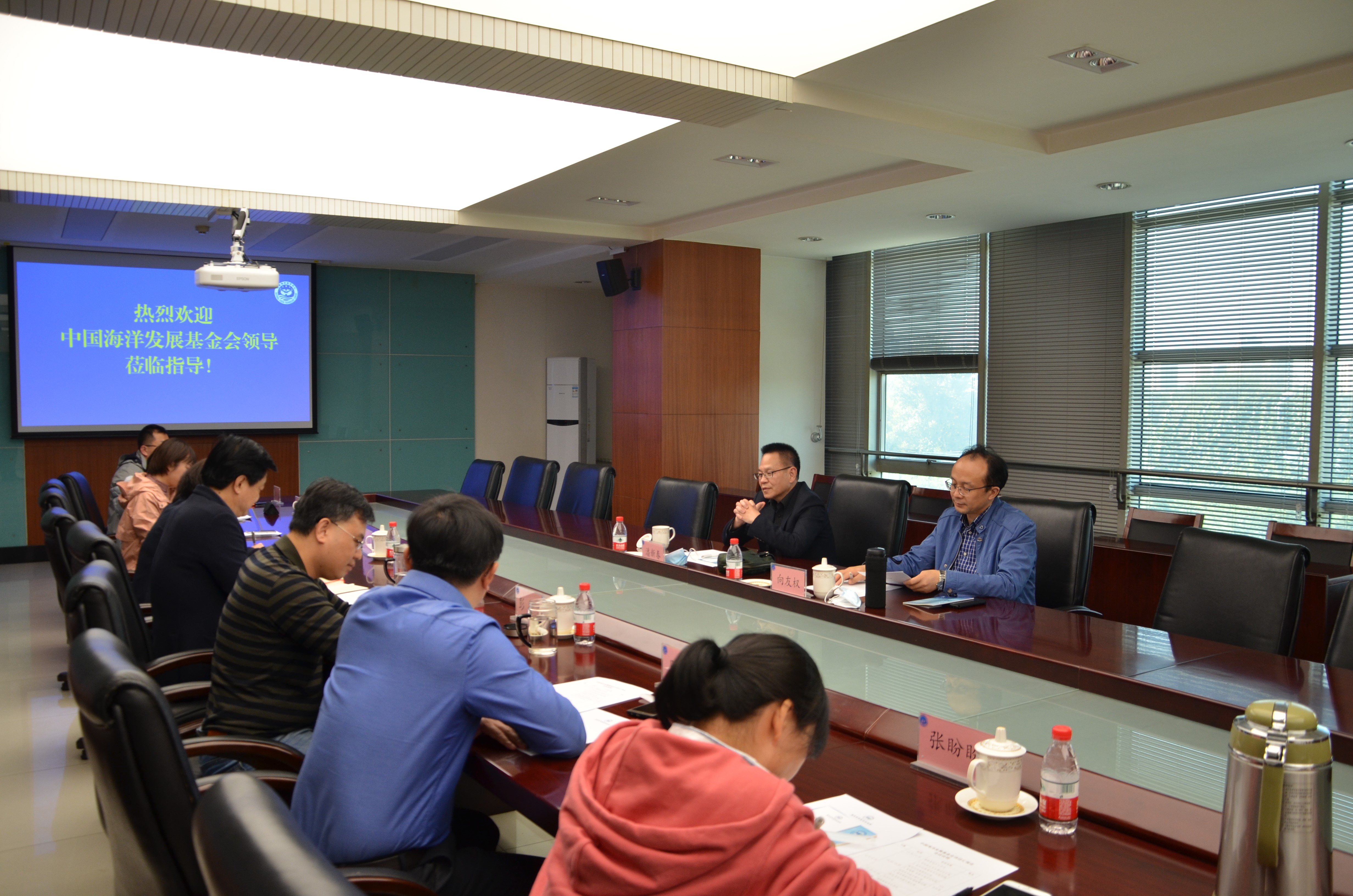 10月12日,中國海洋發展基金會秘書長、海洋空間規劃研究院院長潘新春,副秘書長、副院長向友權一行來我中心開展項目檢查與調研。中心黨委書記兼副主任陳武軍、副主任彭偉、業務處和海域室部門負責人及項目組成員參加會議。