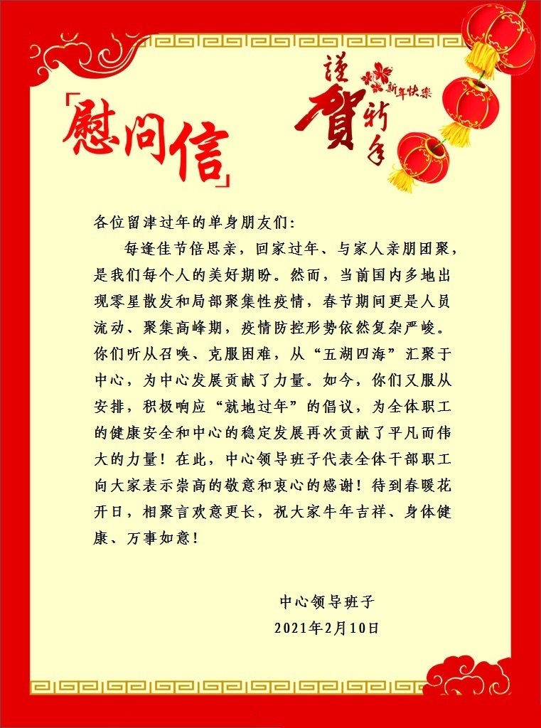 中心廣大單身職工“舍小家顧大家”,積極響應“就地過年”的倡議,為中心全體職工健康安全和中心的穩(wěn)定發(fā)展貢獻了平凡而偉大的力量。中心領導班子通過慰問信,表達了對他們響應號召、就地過年的行動的充分肯定,向默默支持他們的家人們表示衷心感謝,并致以新春佳節(jié)的問候。相關部門認真落實中心黨委關于做好留津單身職工就地過年服務保障工作的部署,為中心留津過年的23位單身職工送去了一份天津傳統(tǒng)糕點,讓單身職工們留津也能感受到在家團圓的溫暖和濃濃的年味,為他們送去黨的溫暖和組織的關愛。(辦公室、黨辦、工會)