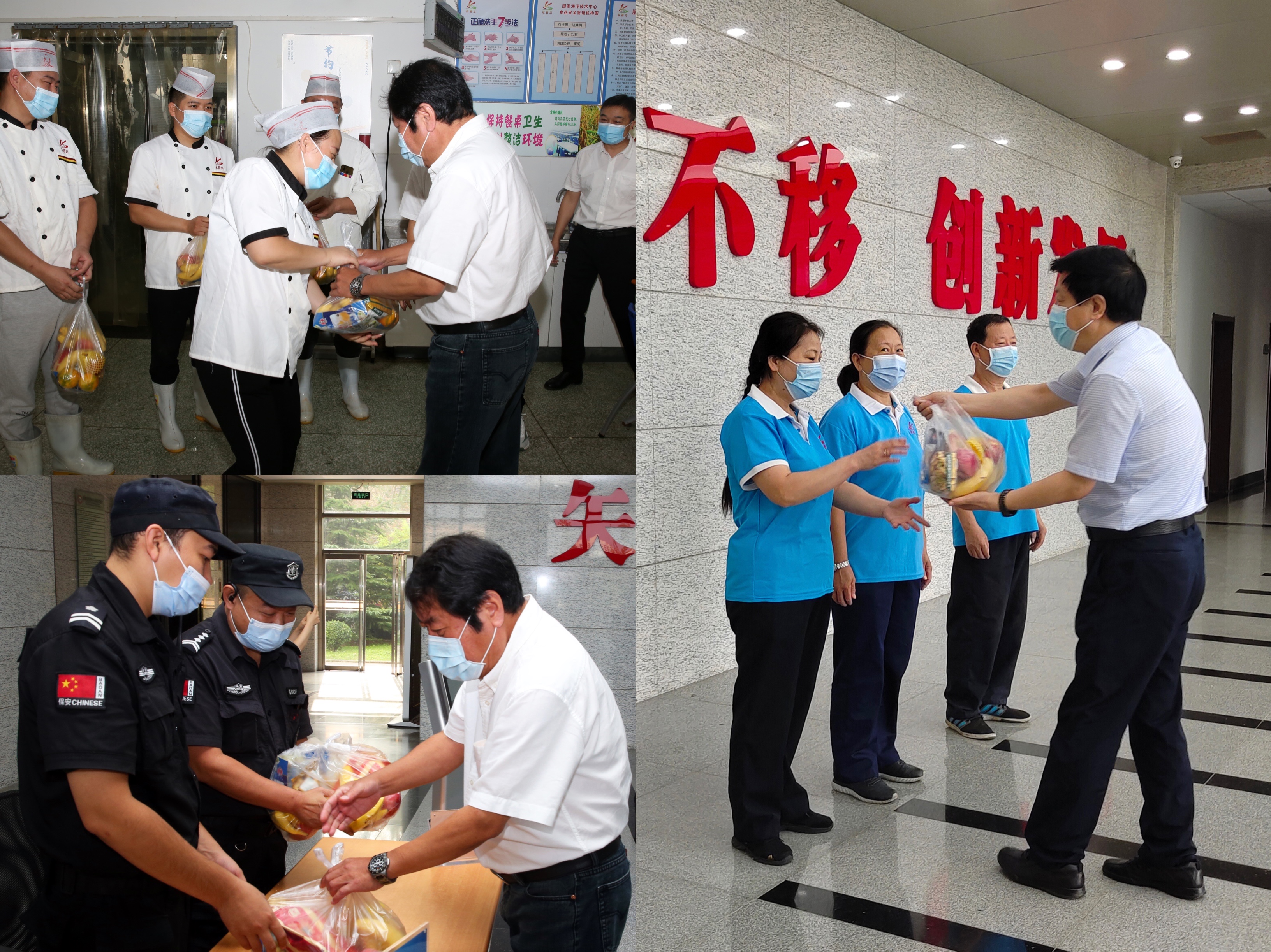 國慶前夕,中心主任韓家新、黨委書記陳武軍分別對保安、保潔、職工食堂后廚等工作人員進行了慰問,向他們送上慰問品并致以節日問候。