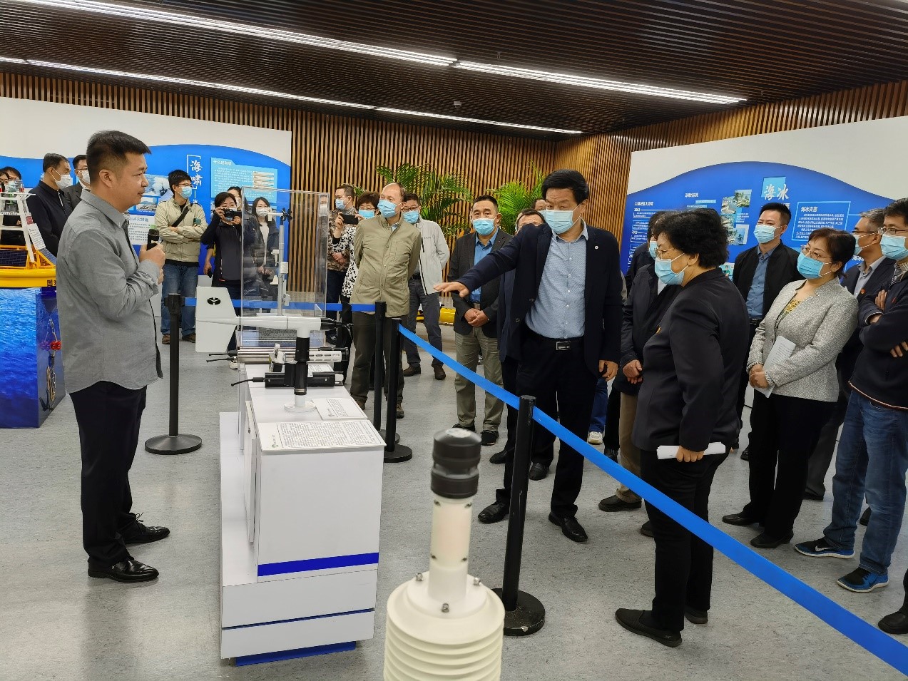 天津市規(guī)劃展覽館現(xiàn)場展覽分為前言、地質(zhì)災(zāi)害篇、海洋災(zāi)害篇、森林災(zāi)害篇、林草生物災(zāi)害篇5部分內(nèi)容,中心在海洋災(zāi)害展區(qū)展示了西風(fēng)帶浮標(biāo)、海嘯浮標(biāo)、風(fēng)速風(fēng)向傳感器等近10件儀器實物及模型展品,中心黨委書記陳武軍參加開幕式并蒞臨現(xiàn)場指導(dǎo),中心離岸部工程師彭家忠作為科普講解員為參觀者講解了各儀器在海洋防災(zāi)減災(zāi)中起到的重要作用,深入淺出的回答觀眾的提問,取得了很好的科普及宣傳效果。