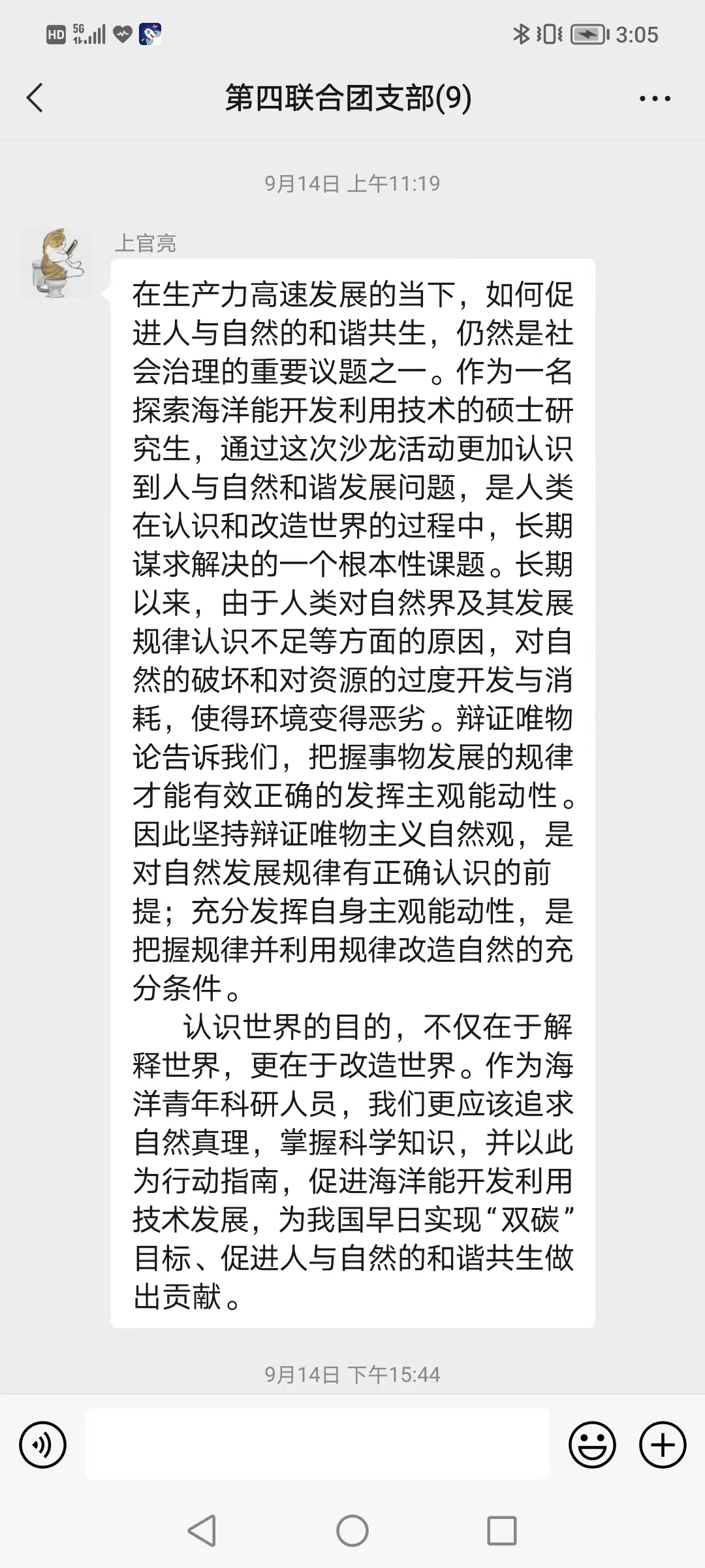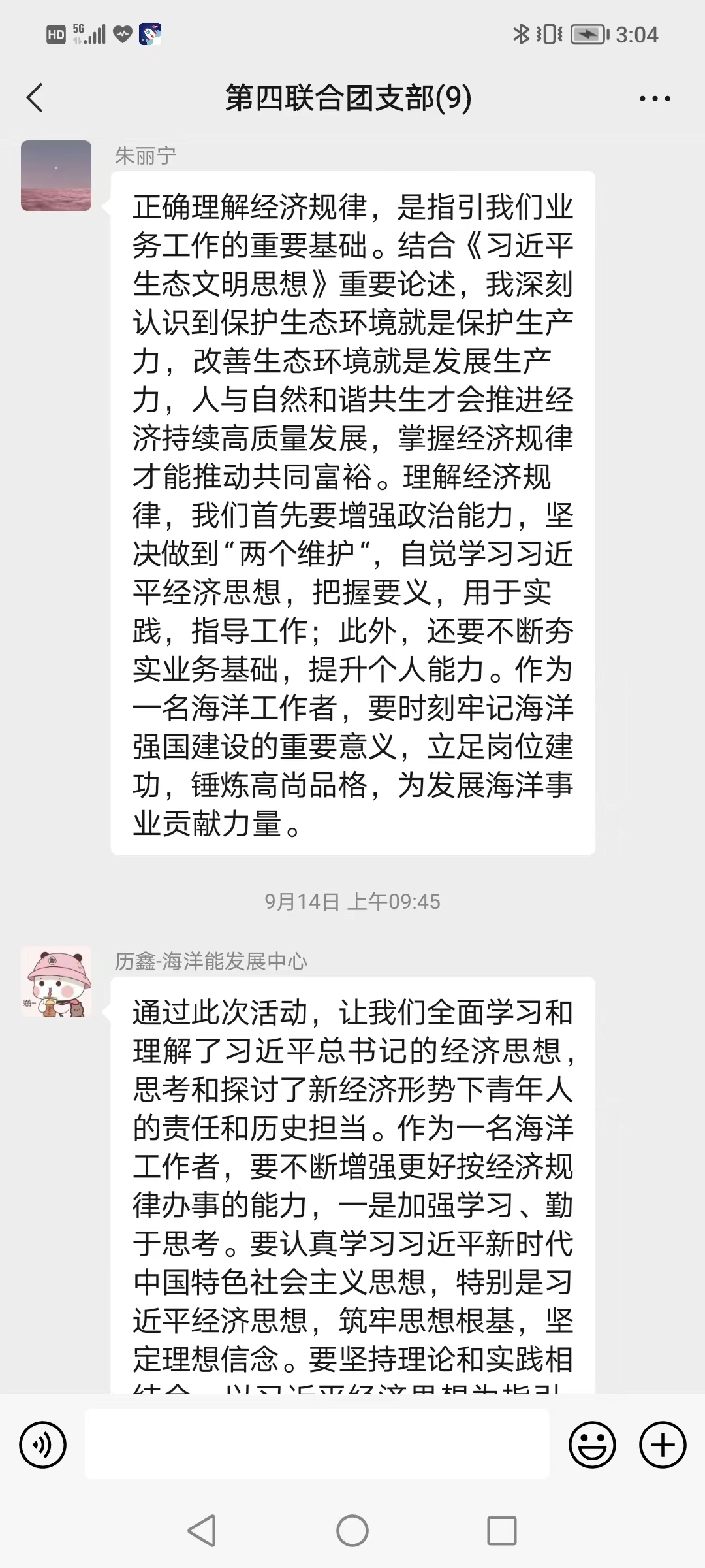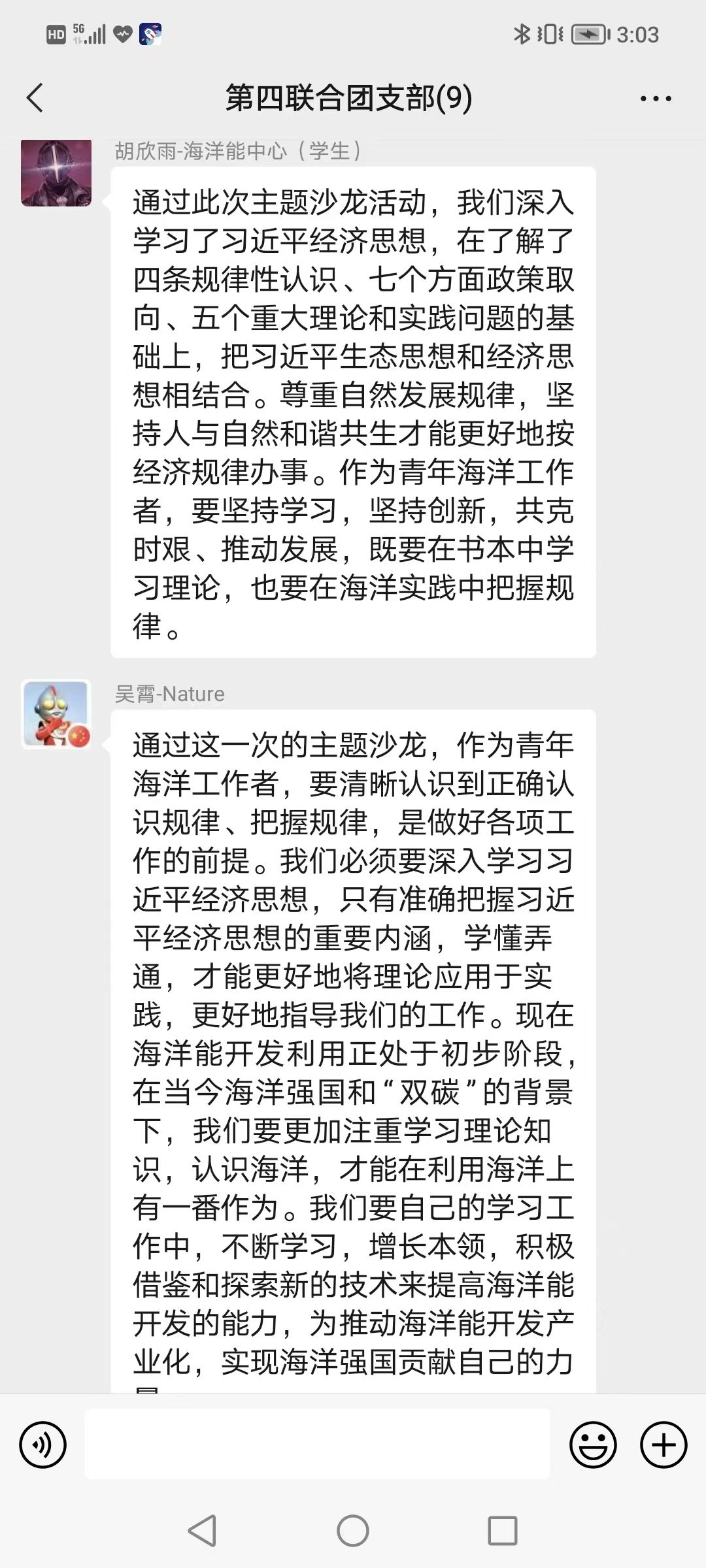 通過參加本次專題活動,支部團員紛紛表示,作為新時代的海洋青年,既要在書本上下功夫,深入學習習近平新時代中國特色社會主義思想的理論內涵和實踐要求,又要在工作中下功夫,更加科學認識經濟發展規律、更加準確把握自然內在規律,苦練本領、積極作為,為推動經濟與生態環境高質量協同發展貢獻青春力量。(第四聯合團支部 蘆穎)