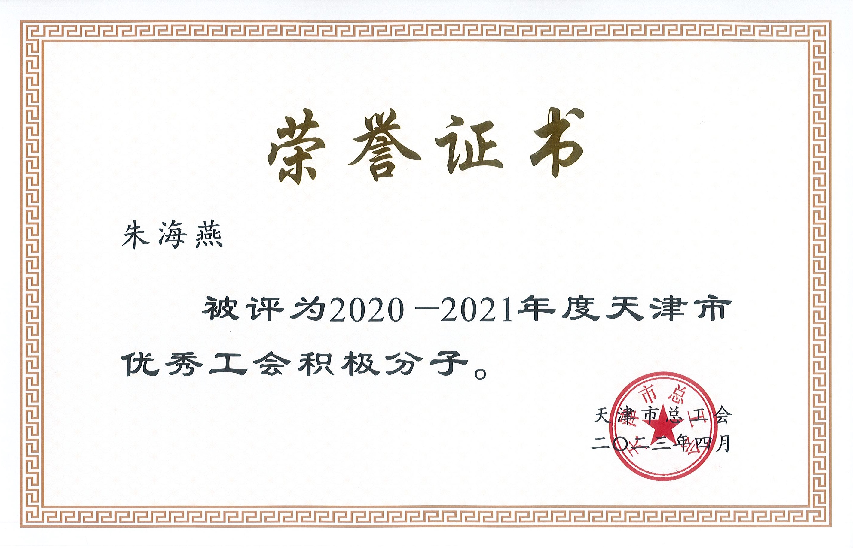 黨群建設(shè)近日,天津市總工會印發(fā)《關(guān)于表彰2020-2021年度天津市模范職工之家、模范職工小家、優(yōu)秀工會工作者、優(yōu)秀工會積極分子和優(yōu)秀工會之友的決定》,中心辦公室分工會主席朱海燕名列其中,榮獲天津市優(yōu)秀工會積極分子。