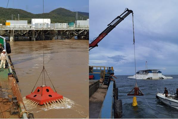圖 潮流能發電裝置(左)和波浪能發電裝置(右)現場測試