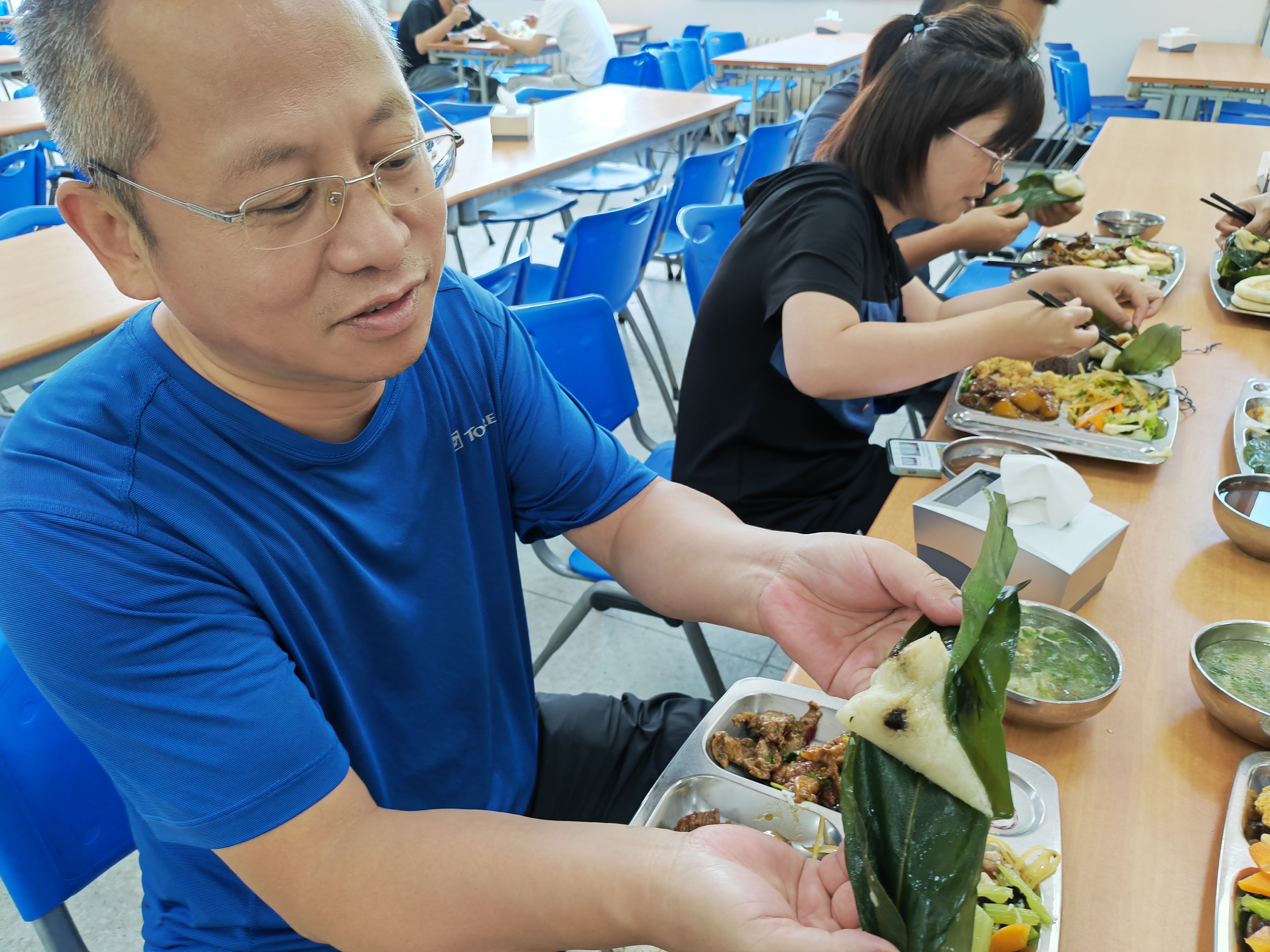6月21日,中心職工在食堂吃午餐時都可以挑選一枚粽子,其中有200余枚是前一天同事們包的,大家吃得津津有味,對于包粽子活動也是津津樂道。在全部的300余枚粽子中,有10枚是蜜豆餡兒的幸運粽,拿到并現場展示的同事可領取精美扇子一把,最終有6位同事收獲了這份幸運。(工會)