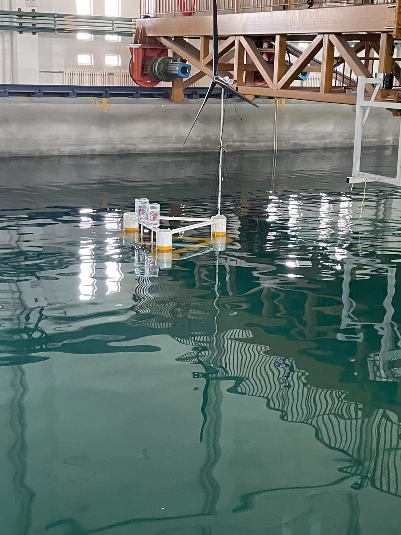 2023年6月19日至7月18日,國家海洋技術中心海洋動力環境實驗室,針對中山大學的“多能聯合發電裝置模型”開展了風浪流耦合工況的水池試驗工作。在雙方科研人員的共同努力下,完成了從風浪流耦合場模擬環境的搭建,到測量系統的高精度同步測量,再到數據處理與分析等工作,順利完成了全部水池試驗內容。