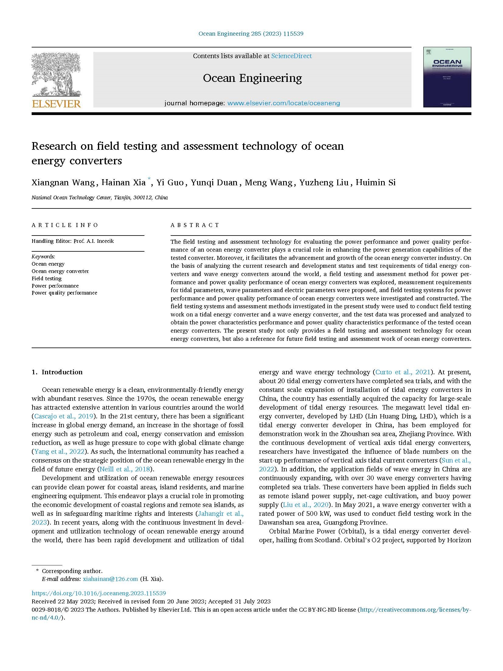 此次在海洋工程領域國際TOP期刊Ocean Engineering發表論文,進一步提升了我中心在海洋能發電裝置現場測試與評價領域內的國際知名度,同時也體現了我中心在海洋能發電裝置現場測試與評價領域內的國際領先水平。(試驗場中心 夏海南)