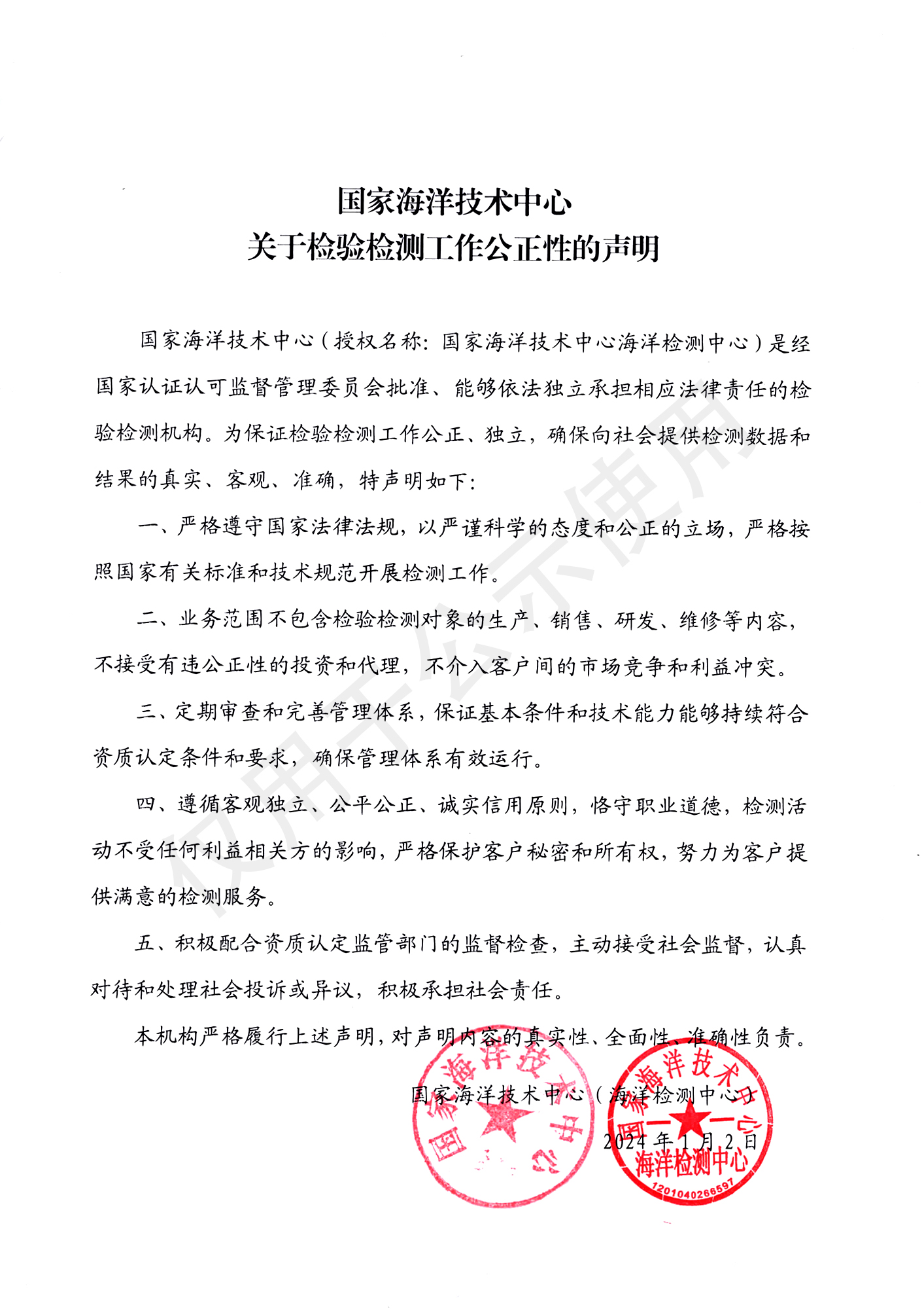 國家海洋技術中心(授權名稱:國家海洋技術中心海洋檢測中心)是經國家認證認可監督管理委員會批準的檢驗檢測機構,業務范圍是對物理海洋(海洋水文、海洋氣象、海洋測繪)、海洋可再生能源(潮流能發電裝置功率特性、波浪能轉換裝置功率特性、電能質量特性)、海洋化學(海水)、海洋生物生態和海洋地質等項目開展檢驗檢測,為國家和地方自然資源管理、海洋生態保護和修復等提供科學、公正、準確的數據和結果。