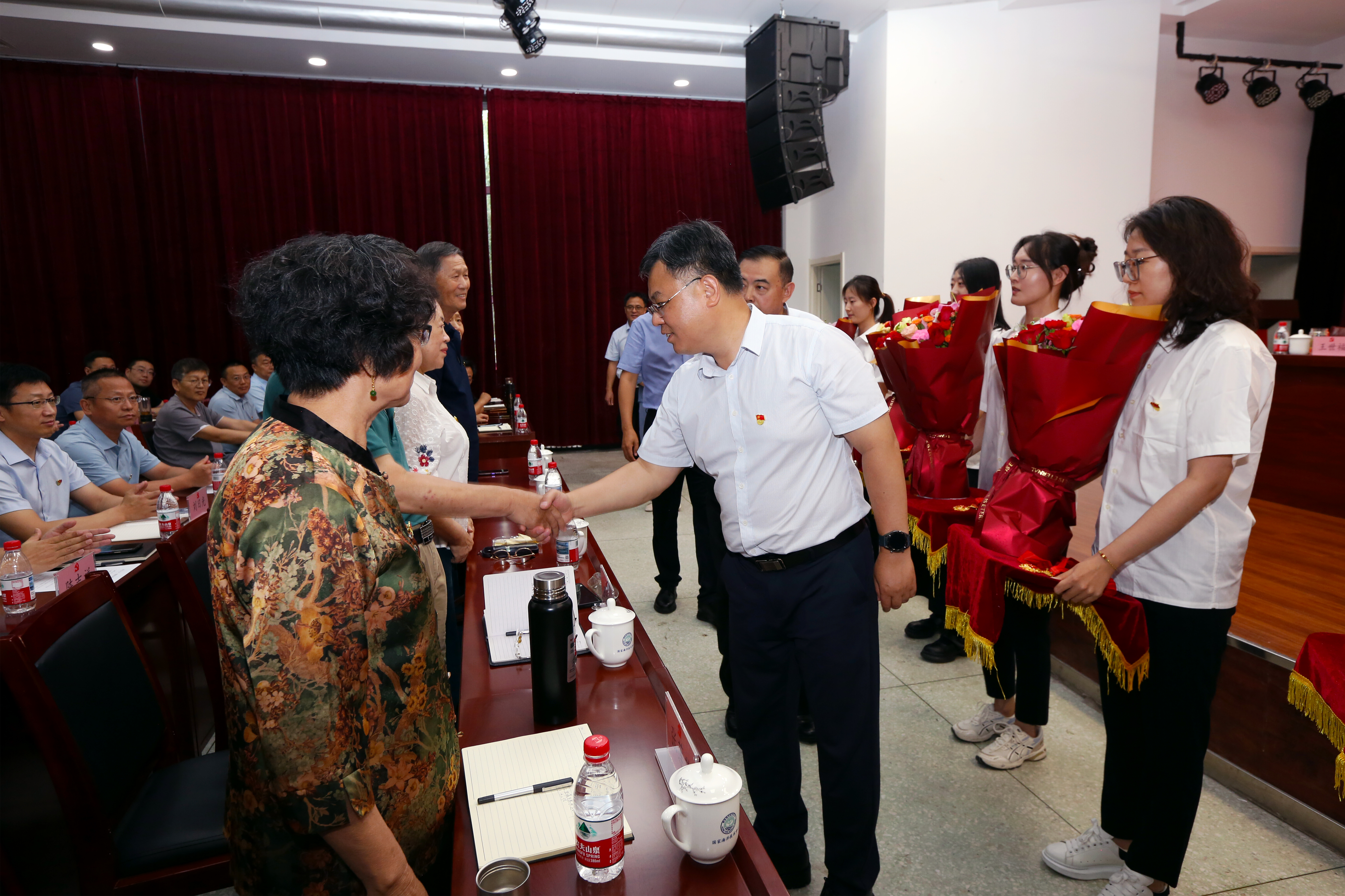 中心副主任隋軍同志在會上宣讀“光榮在黨50年”老黨員名單和中心職工榮獲天津市勞動模范表彰文件。中心領(lǐng)導(dǎo)為光榮在黨50年的老黨員代表頒發(fā)紀念章和鮮花,為獲得天津市勞動模范稱號的宋雨澤同志頒發(fā)獎牌和證書。中心副主任吳姍姍同志宣讀中心榮獲中央和國家機關(guān)、部直屬機關(guān)“四好”黨員名單,中心紀委書記王占坤同志宣讀中心2023-2024年度“兩優(yōu)一先”表彰決定。中心領(lǐng)導(dǎo)為獲表彰的優(yōu)秀共產(chǎn)黨員、優(yōu)秀黨務(wù)工作者和先進黨支部頒發(fā)證書和獎牌。“兩優(yōu)一先”代表上臺發(fā)言,交流支部工作和黨務(wù)工作經(jīng)驗做法,暢談發(fā)揮先鋒模范作用和崗位建功的工作感悟,一致表示要不忘初心,牢記使命,勇挑重擔(dān),拼搏奮進,為海洋強國建設(shè)和自然資源事業(yè)高質(zhì)量發(fā)展貢獻智慧和力量。