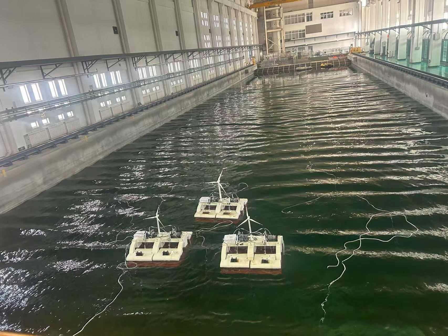 試驗場中心依托承擔的2023年重點研發計劃項目子課題“漂浮式多能互補裝置及裝置群物理模型試驗研究”,深入開展了陣列試驗與測試方法研究,形成了科學系統的試驗方法與精準的測試技術。今年7月至8月初,在海洋動力環境實驗室開展了多能互補裝置單機與陣列測試,順利完成了裝置單機各級轉換效率與運行響應、各種陣列組合后的裝置能量轉化性能的測試。本次多能互補試驗裝置由項目合作單位中國科學院廣州能源所研制。