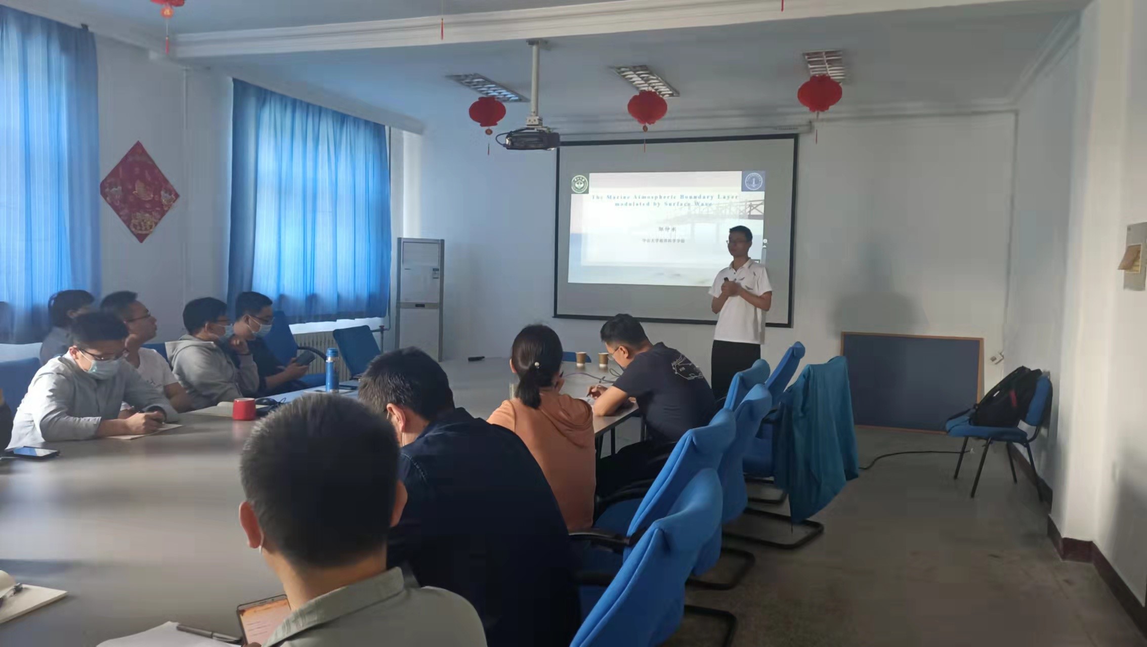 鄒仲水和鄧增安教授分別做了題為“The marine atmospheric boundary layer modulated by surface wave”和“波浪破碎對渤海動力過程影響的數值模擬”的報告,結合自身的研究成果和實踐經驗介紹了海浪對小尺度海氣相互作用的影響,從科學角度對海浪和海氣界面要素觀測、反演提出了自己的見解。海保部兩位研究生結合部門工作和導師方向分別作了“基于漂流式海氣界面浮標觀測的臺風期間海氣通量研究”和“基于波浪譜觀測的矢量風反演技術研究”報告,介紹了基于現場觀測裝備的海氣相互作用研究和風浪聯合反演技術研究進展。會議中大家圍繞如何進行科學觀測、反演算法研究和觀測數據應用三個方面開展了理論和技術層面的討論,并對海浪影響海洋噪聲的機理進行了深入探討。