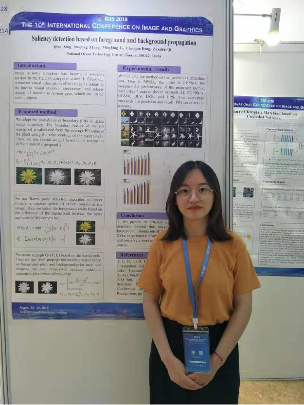邢晴撰寫的論文“Saliency detection based on foreground and background propagation”在本次大會上以海報的形式進行了展示。該論文提出了一種基于前景和背景傳播的顯著性檢測算法,即結合目標的前景和背景信息,最大限度地保留了顯著性目標的完整邊緣。論文中的內容引起了現場學者的濃厚興趣,會上就論文中涉及的關鍵學術思想和技術難點與其他學者進行了交流與討論。